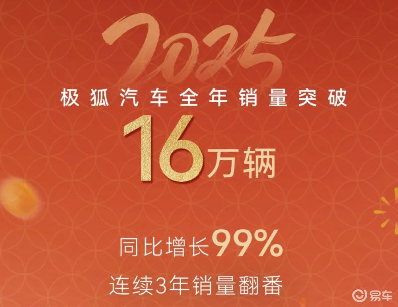 这份战略布局的底气,恰恰源于刚刚过去的2025年,极狐以沉稳务实的步伐,走出了一条令人惊叹的高质量增长曲线。数据显示,极狐在延续2024年同比增长近170%的基础上,2025年全年销量超16万辆,同比增幅高达99%,连续3年实现销量翻番(2023-2025年);更值得关注的是,其2025年上半年销量同比增长更是突破200%,从年初便展现出高增长韧性,打破了新能源市场下半年集中爆发的惯性。