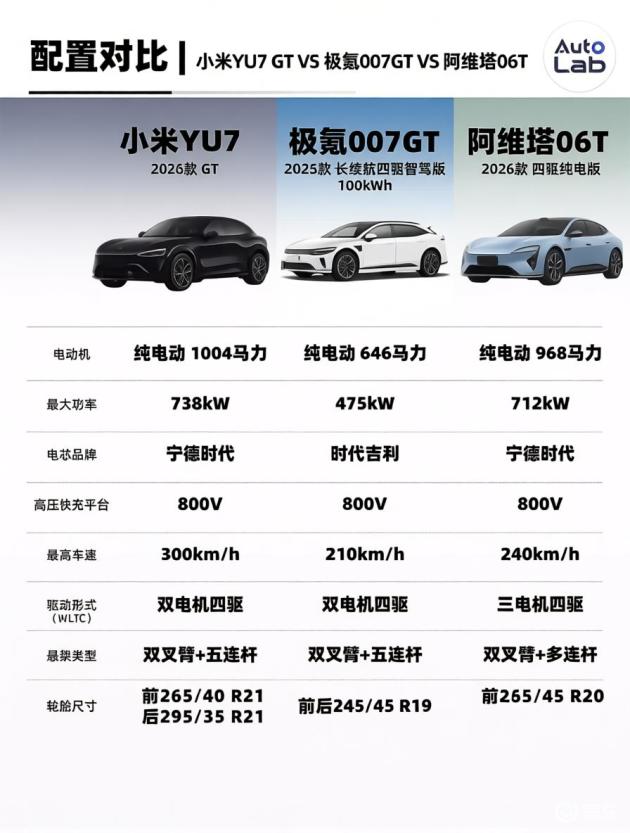 动力性能方面,三款车型差异显著。阿维塔06T纯电版提供后置双电机及前单电机+后双电机的四驱方案,三电机四驱版系统总功率达712kW,总马力近1000匹,预计零百加速可进入2秒级别。小米YU7 GT的表现更为激进,双电机四驱版总功率738kW,马力达1004匹,极速可达300km/h,轮胎规格也更为激进,前265/40 R21、后295/35 R21的高性能宽胎,性能表现直逼小米YU7 Ultra。相比之下,极氪007GT显得更为克制,系统总功率475kW,零百加速2.95秒,虽不及前两者,但在实用与性能之间找到了平衡点。