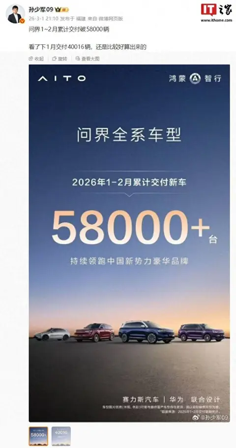 2026年一开年,问界汽车就卖出去五万八千多台车,一月卖出四万多台,二月接着又卖了一万八千来台,这成绩放在眼下整个车市不太热闹的情况下,确实挺显眼,再看去年全年,问界总共卖了将近五十九万台车,比前一年涨了三成多,十二月一个月就冲到快九万台,连续三个月刷新纪录,今年开头的这个势头,明显还在继续。