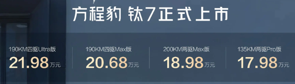 方程豹钛7:插混版17.98万起,纯电闪充版22万起,定位略高。依托比亚迪技术背书,覆盖家用+轻越野全场景,适合愿意为品牌与性能溢价的用户。