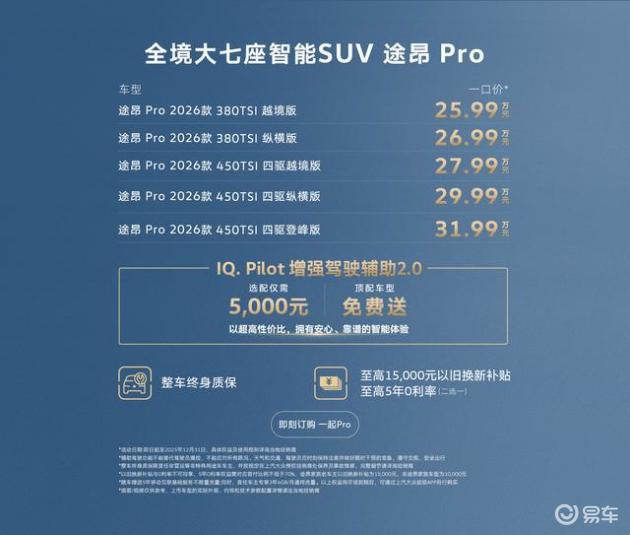 购车成本与长期使用价值的权衡,直接影响用户决策,途昂Pro与探陆在这一维度呈现“短期性价比”与“长期收益”的对比。价格区间上,途昂Pro官方指导价为29.99-35.99万,一口价为25.99-31.99万,而探陆为23.98-30.18万,探陆在初期购车成本上更具优势。