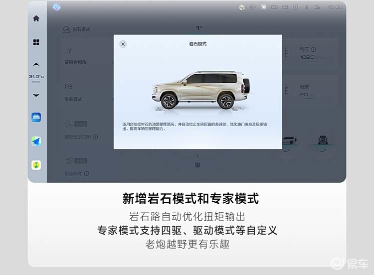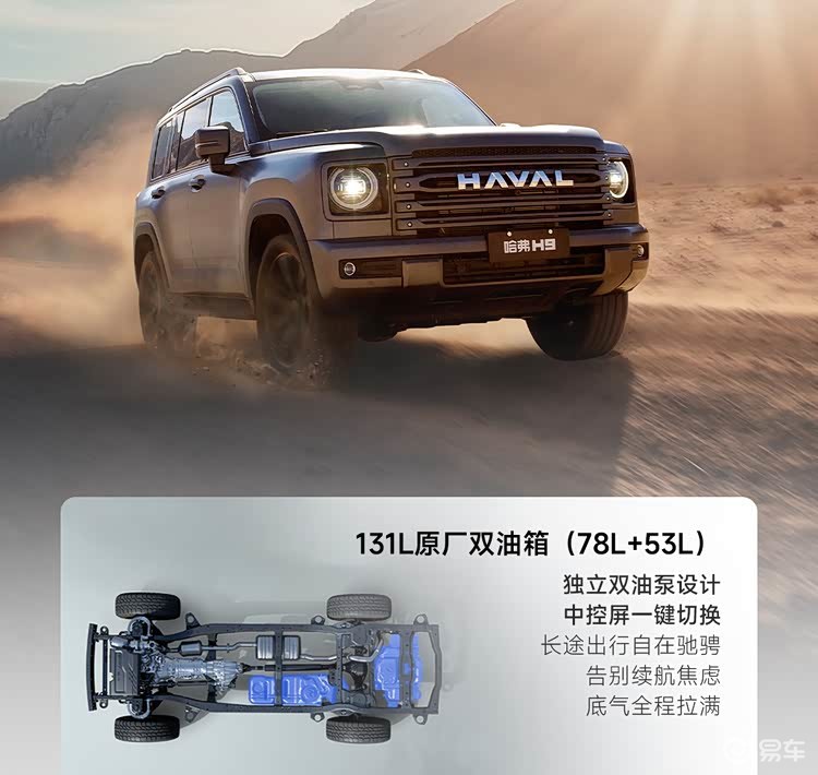 动力部分采用2.4T柴油发动机,最大功率137kW,峰值扭矩490Nm。柴油机的特性是在低转速就能获得较高扭矩,它的峰值扭矩出现在1500rpm。此前需要选装的硅油风扇,在穿越版上是标准配置。前后桥电控差速锁在穿越版上依然是标准配置,越野模式中还增加了岩石模式和专家模式,显然通过能力是有进一步提升的。2.5吨的牵引资质也是标配,能够轻松应付房车、摩托艇或是路亚艇的牵引需求。新车还标配了53L的副油箱,油箱容积从78L增加到了131L,满油续航增加到了1400km,可以应付更长距离的穿越。